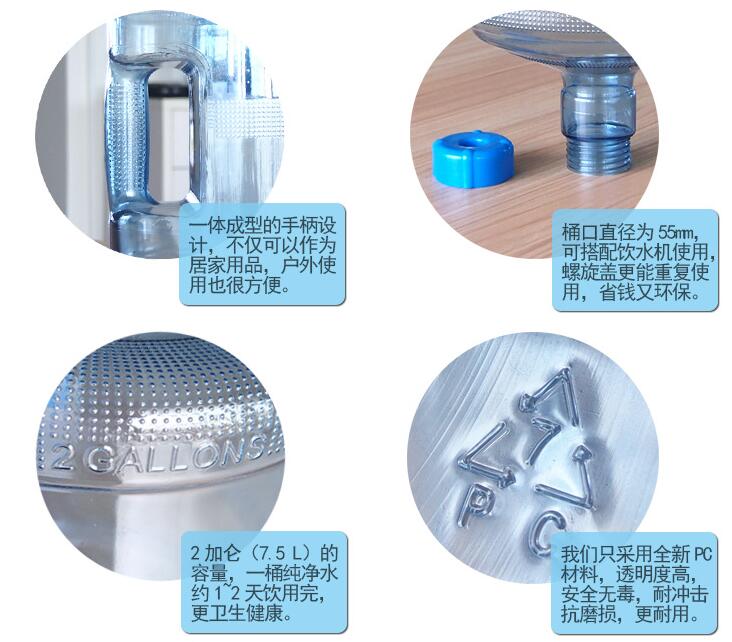 • 產(chǎn)品概述: 食品級(jí)手提2加侖螺紋口PC飲水桶(食品級(jí)硅膠拉環(huán)、墊圈)