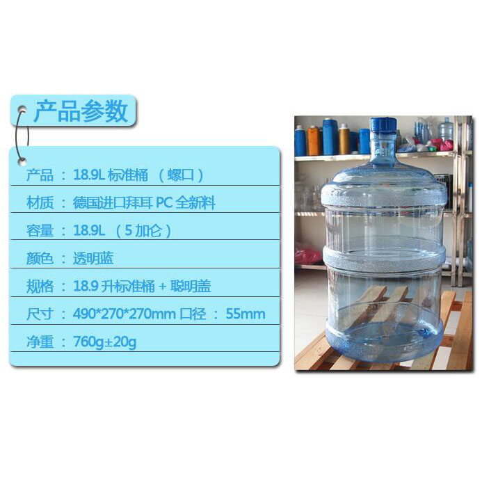 • 產(chǎn)品概述: 標(biāo)準(zhǔn)5加侖螺旋口PC飲水桶.配送螺旋蓋子。